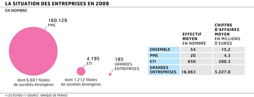 Les entreprises de taille intermédiaire (250 à 5 000 salariés), trop longtemps ignorées des pouvoirs publics comme des économistes, ont été définies statistiquement récemment par la loi de modernisation de l'économie de 2008. Elles sont 4 700 qui constituent le maillon fragile du tissu économique français entre une base très large de TPE et PME (2,4 millions) et 235 grandes entreprises de dimension mondiale. Il y a en France deux fois moins d'ETI qu'en Allemagne ou qu'en Grande Bretagne. De plus, leur nombre est stable dans notre pays, alors que pour les autres catégories, il est en augmentation.